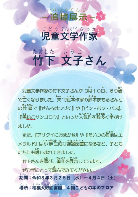 追悼展示「竹下文子さん」 2026年03月31日(火曜日)相模大野 児童文学作家の竹下文子さんが亡くなりました。夫で絵本作家の鈴木まもるさんとの共著で『せんろはつづく』や『ピン・ポン・バス』、『黒ねこサンゴロウ』といった人気作を数多く手がけました。 竹下さんを偲び、著作を展示しています。 ぜひ手にとって読んでみてください 展示期間 令和8年3月25日(水曜日)から令和8年4月4日(土曜日)まで 展示場所 相模大野図書館 4階 こどもの本のフロア 一覧へ戻る